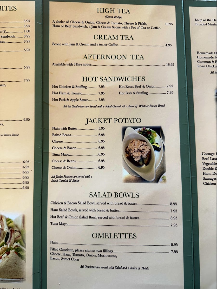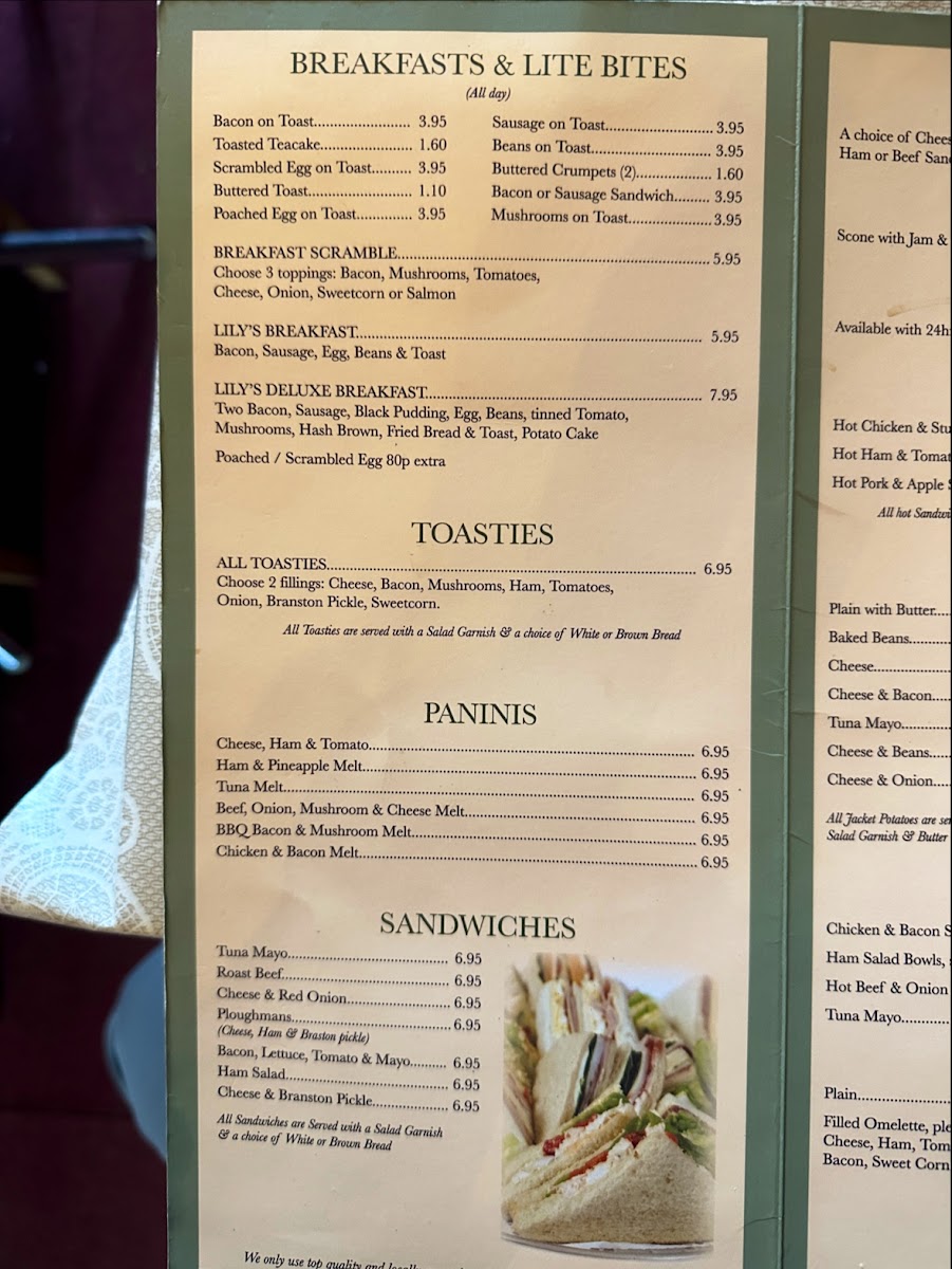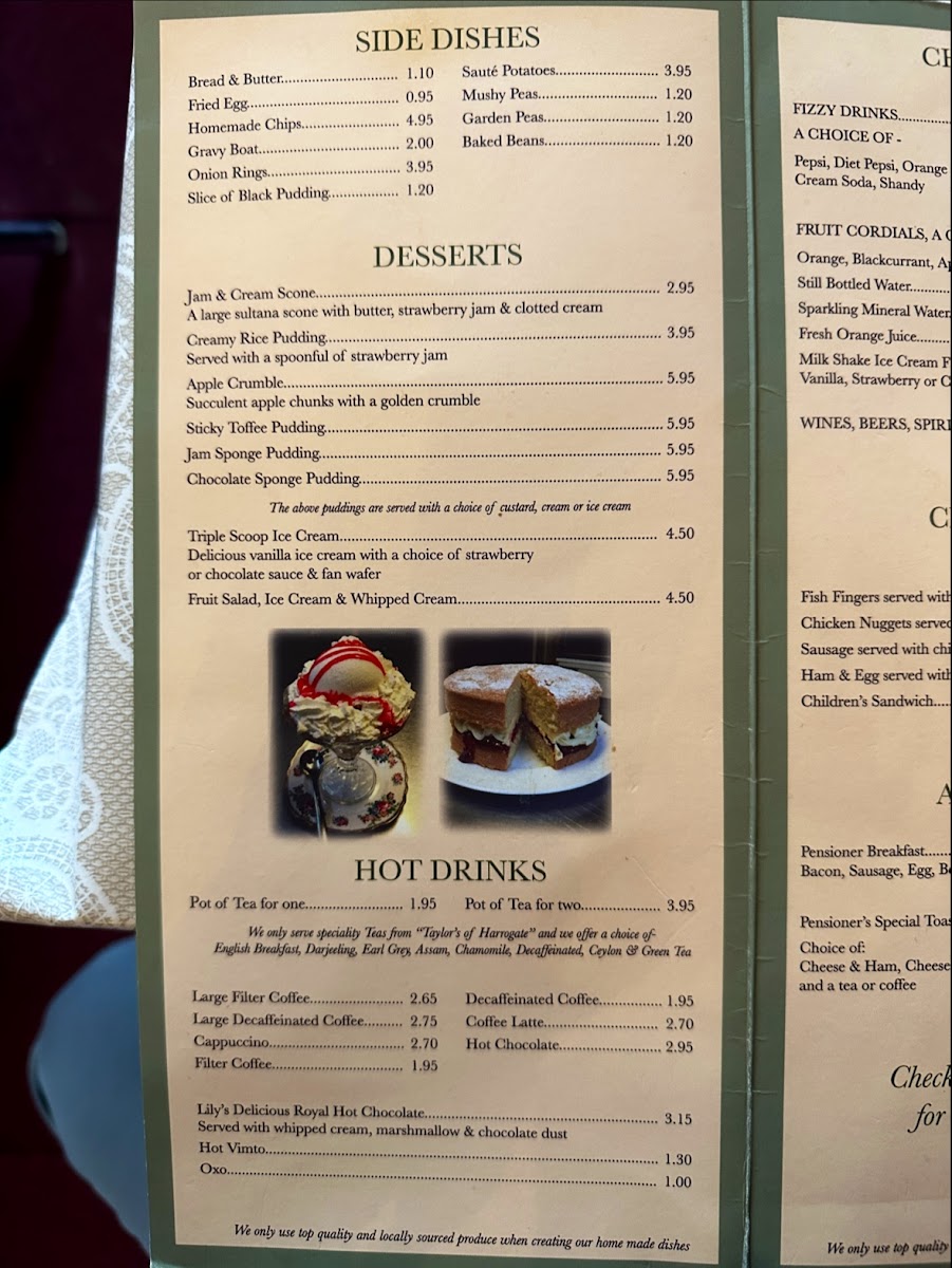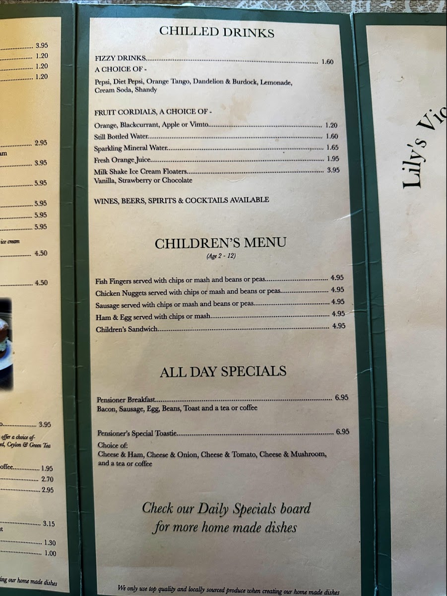 Lily's Victorian Tea Rooms offers a delightful variety of traditional British dishes, perfect for a cozy meal. For side dishes, you can choose from classics like Bread & Butter or Homemade Chips, and even more indulgent options like Onion Rings or a Slice of Black Pudding. Their desserts are a treat, with choices like Creamy Rice Pudding, Chocolate Sponge Pudding, and the ever-popular Sticky Toffee Pudding. If you're in the mood for a hot drink, the Large Filter Coffee or Cappuccino pairs beautifully with any meal. The restaurant also serves hearty Jacket Potatoes, including options like Cheese & Bacon or Tuna Mayo for a satisfying bite. For those craving a hot sandwich, options like Hot Chicken & Stuffing or Hot Roast Beef & Onion are flavorful favorites. You can also enjoy refreshing Salad Bowls, with choices such as Chicken & Bacon Salad Bowl or Ham Salad Bowl, each served with Bread & Butter. If you prefer something lighter, the Filled Omelette with your choice of two fillings is a great option. There’s even a children's menu with fun options like Fish Fingers and Chicken Nuggets. Don’t forget the All Day Specials, including the beloved Pensioner Breakfast or Pensioner's Special Toastie. With a menu that combines comfort food and delicious variety, Lily's Victorian Tea Rooms is a charming spot to indulge in a satisfying meal.